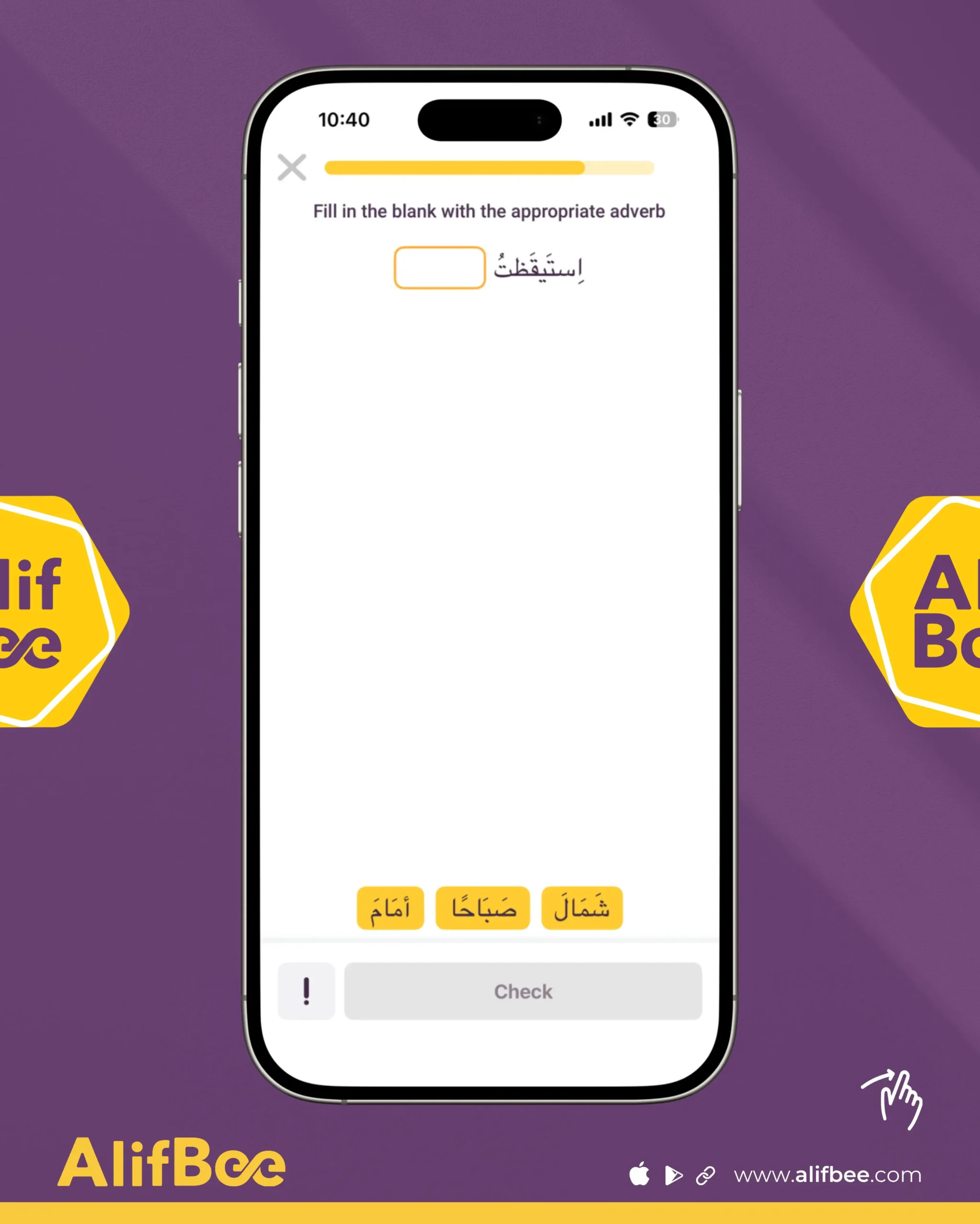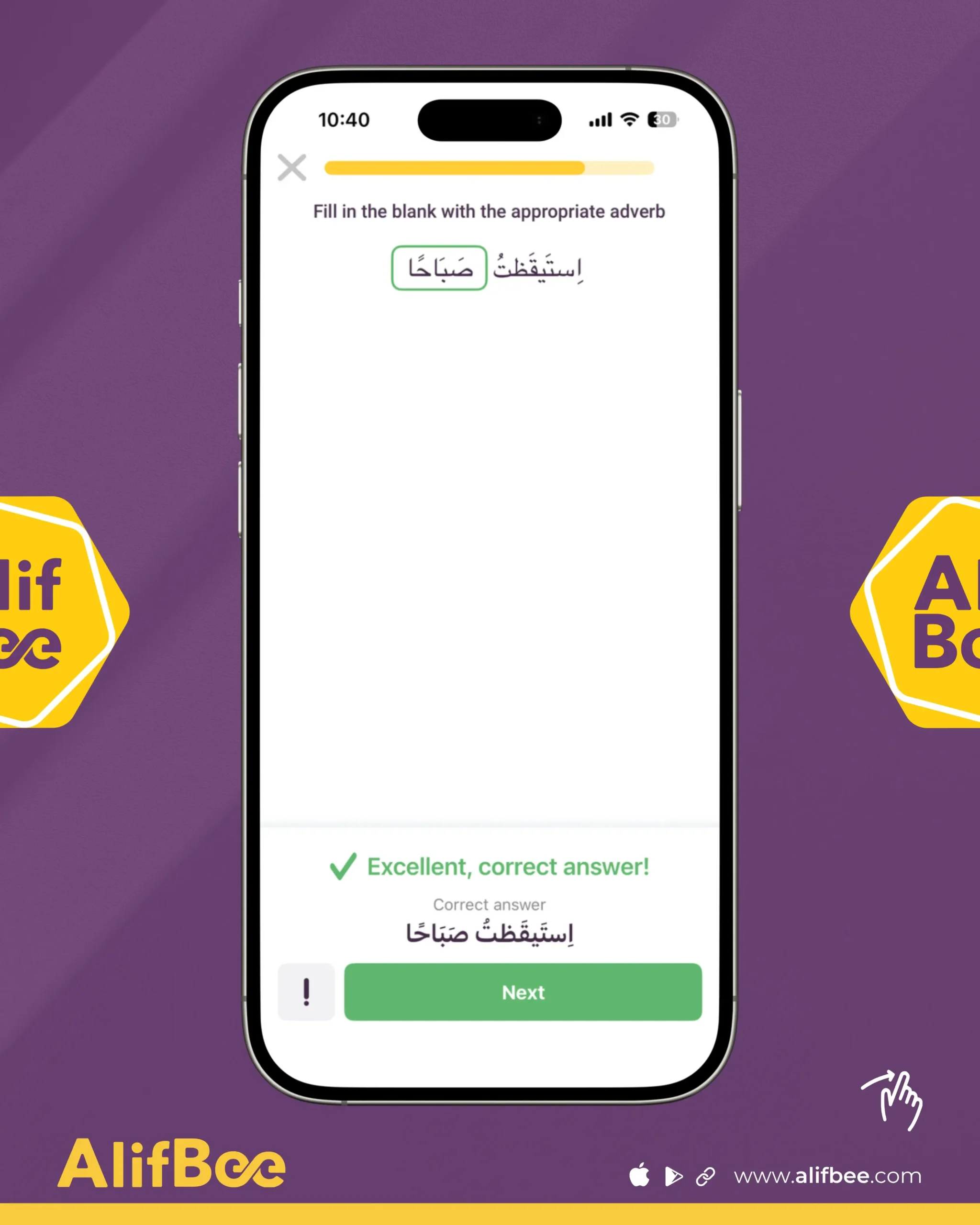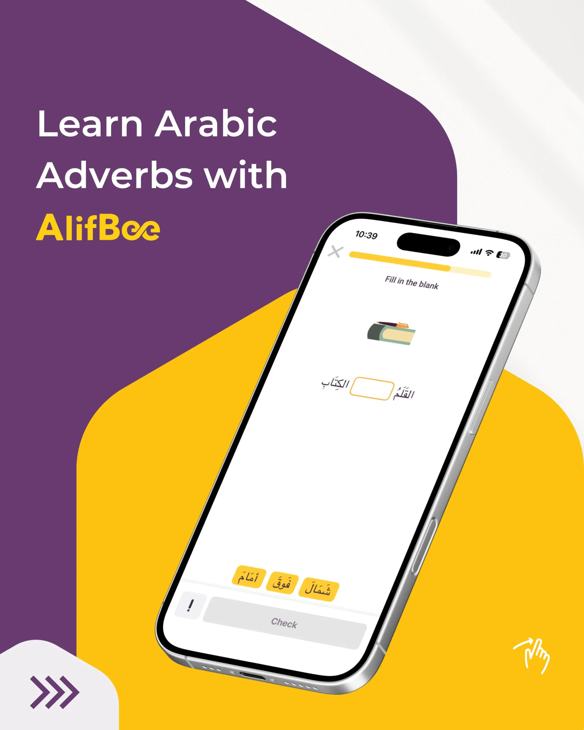 Practice Arabic adverbs in real sentences, listen to the correct pronunciation, and test yourself with interactive exercises in the AlifBee app.