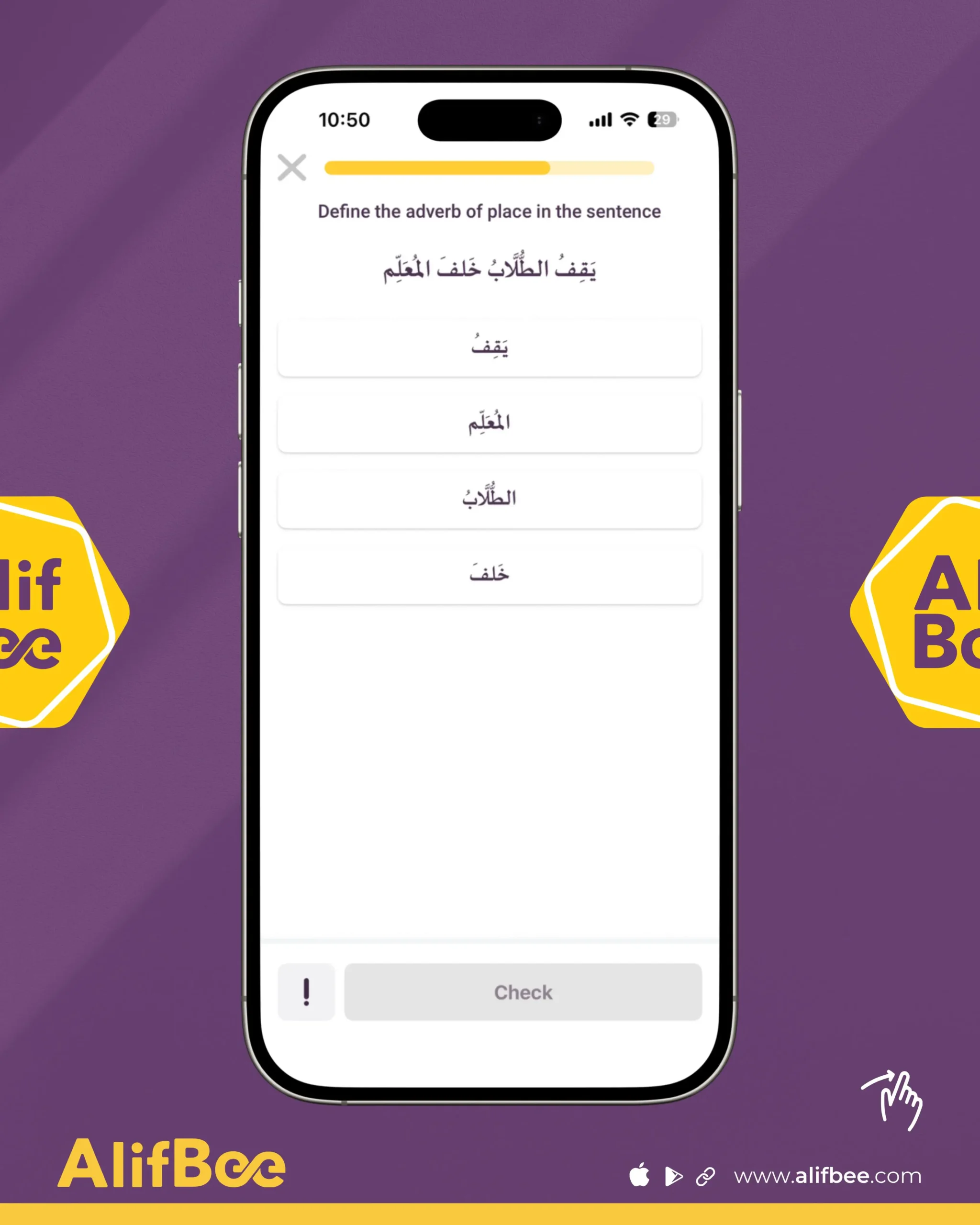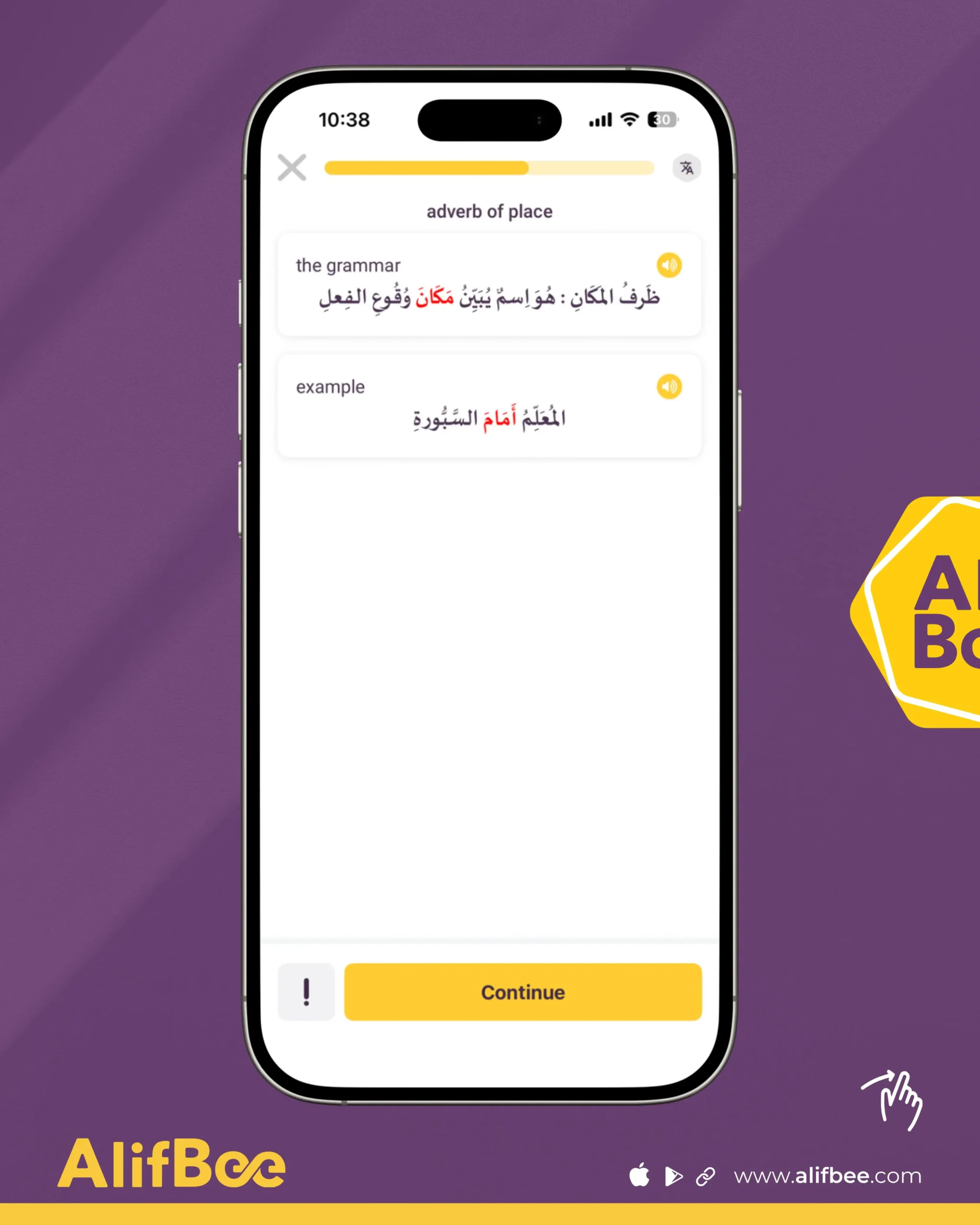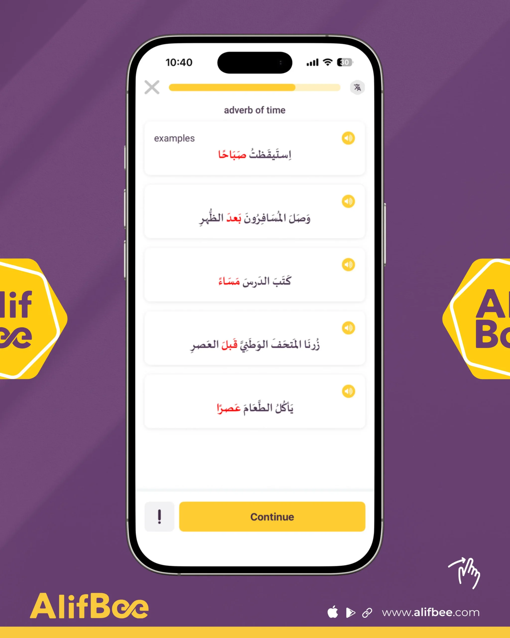 Practice Arabic adverbs in real sentences, listen to the correct pronunciation, and test yourself with interactive exercises in the AlifBee app.