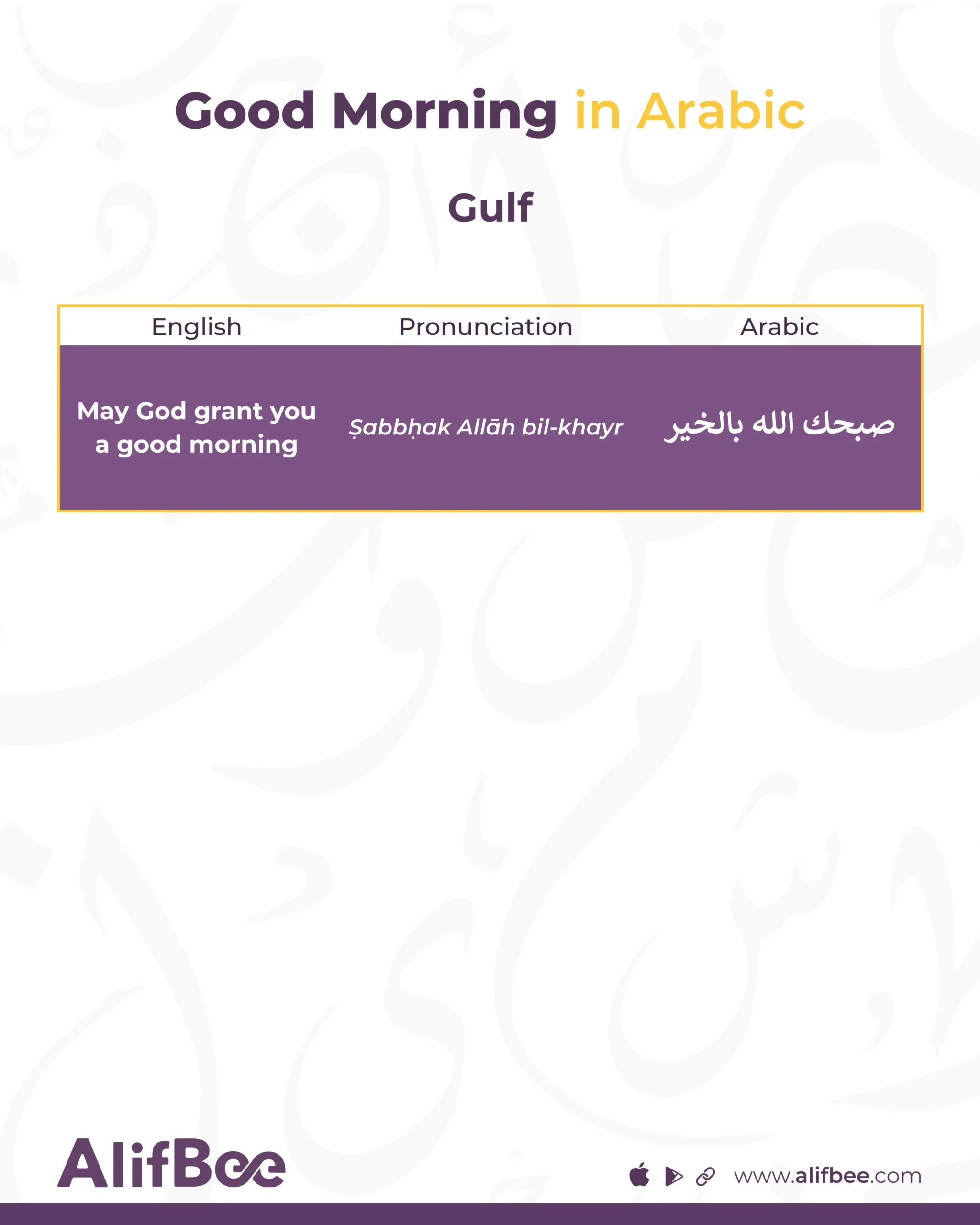 If you want to greet someone in a traditional, polite, and respectful way, you can say Ṣabbḥak Allāh bil-khayr, which literally means “May God grant you a good morning.” It is a common way in the Gulf region for respectfully greeting close friends or family members. It is also a common way to say good morning in muslim communities.