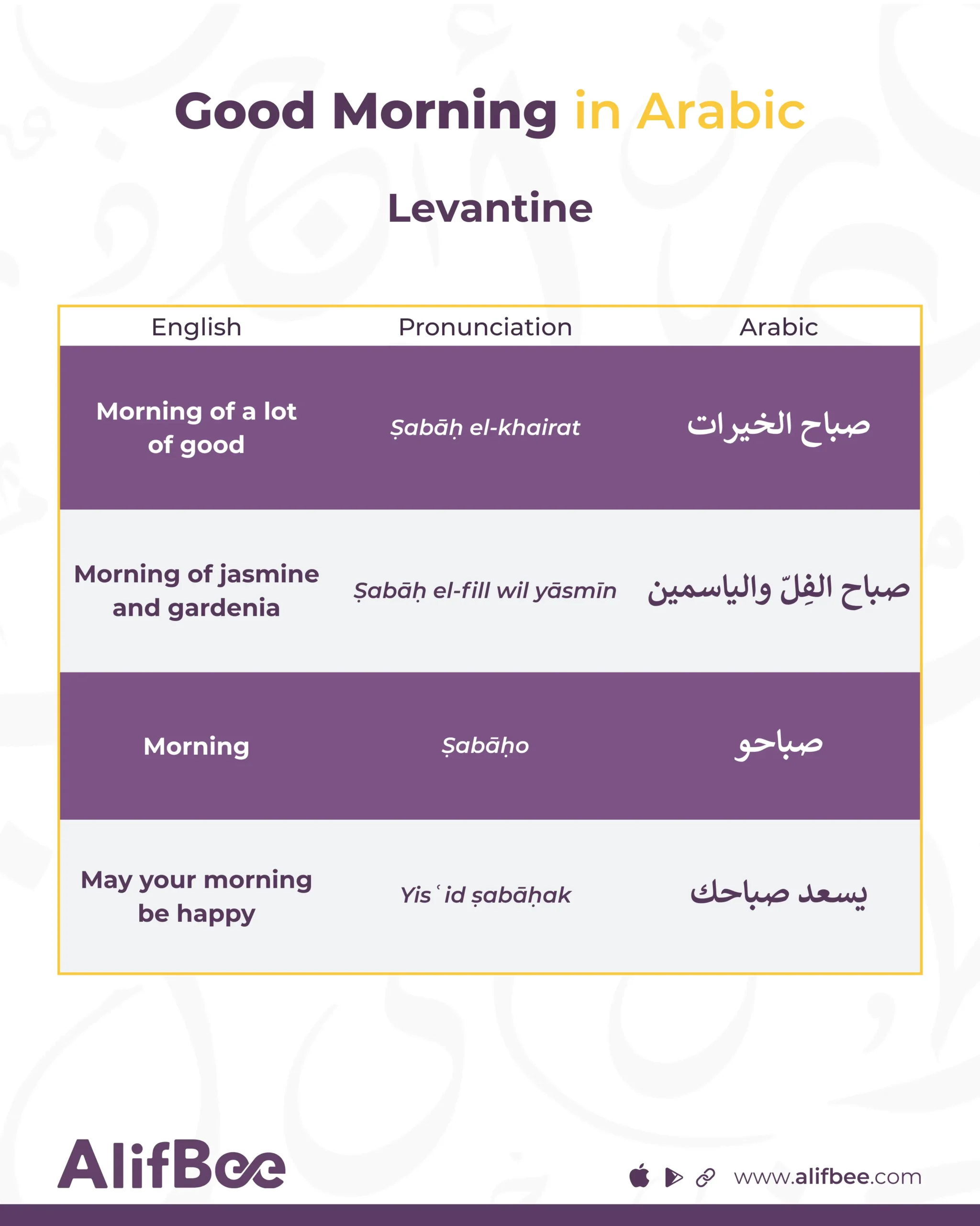 In the Levantine region, which includes Lebanon, Syria, Jordan, and Palestine, greetings are used as a more metaphorical and poetic way to express oneself. You can say a simple Ṣabāḥo to greet someone in the Levantine dialect. However, if you’re speaking to someone very close, like a family member or friend, you can greet them with Ṣabāḥ el-fill wil yāsmīn.