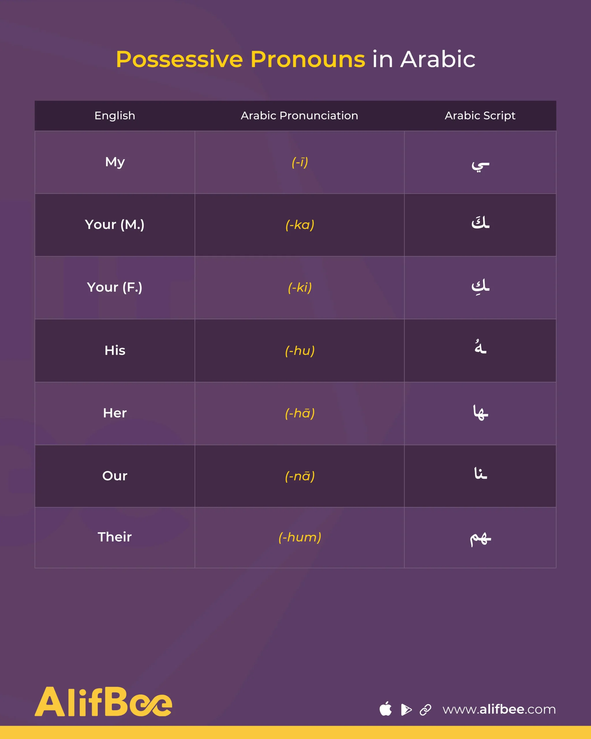 Unlike English, Arabic possessive pronouns are not separate words, but rather suffixes that attach directly to nouns, so there is no word for “my,” “yours,” “his,” “her,” or “their.”