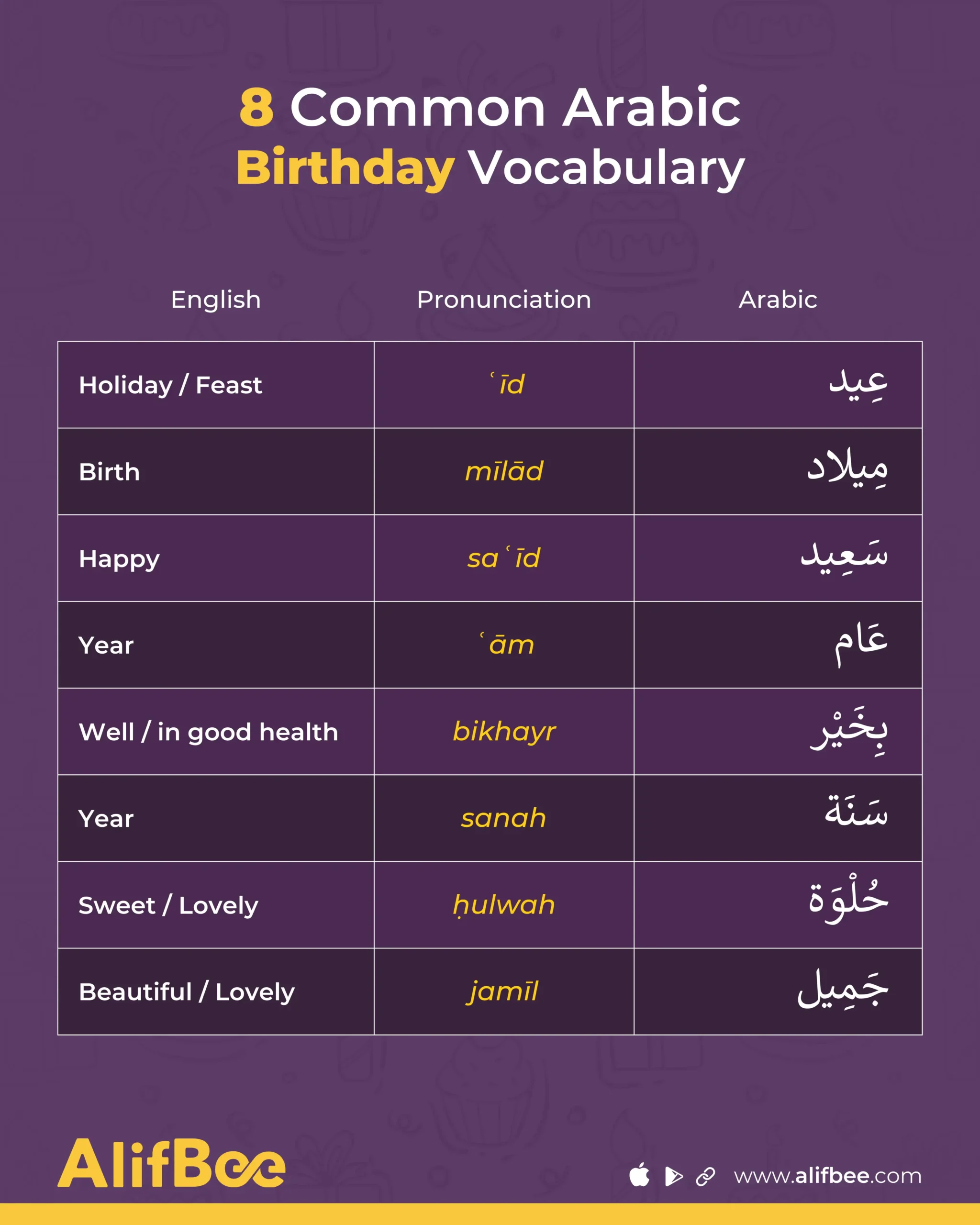 It is a good idea to start with commonly used words that you may hear in birthday greetings in Arabic.