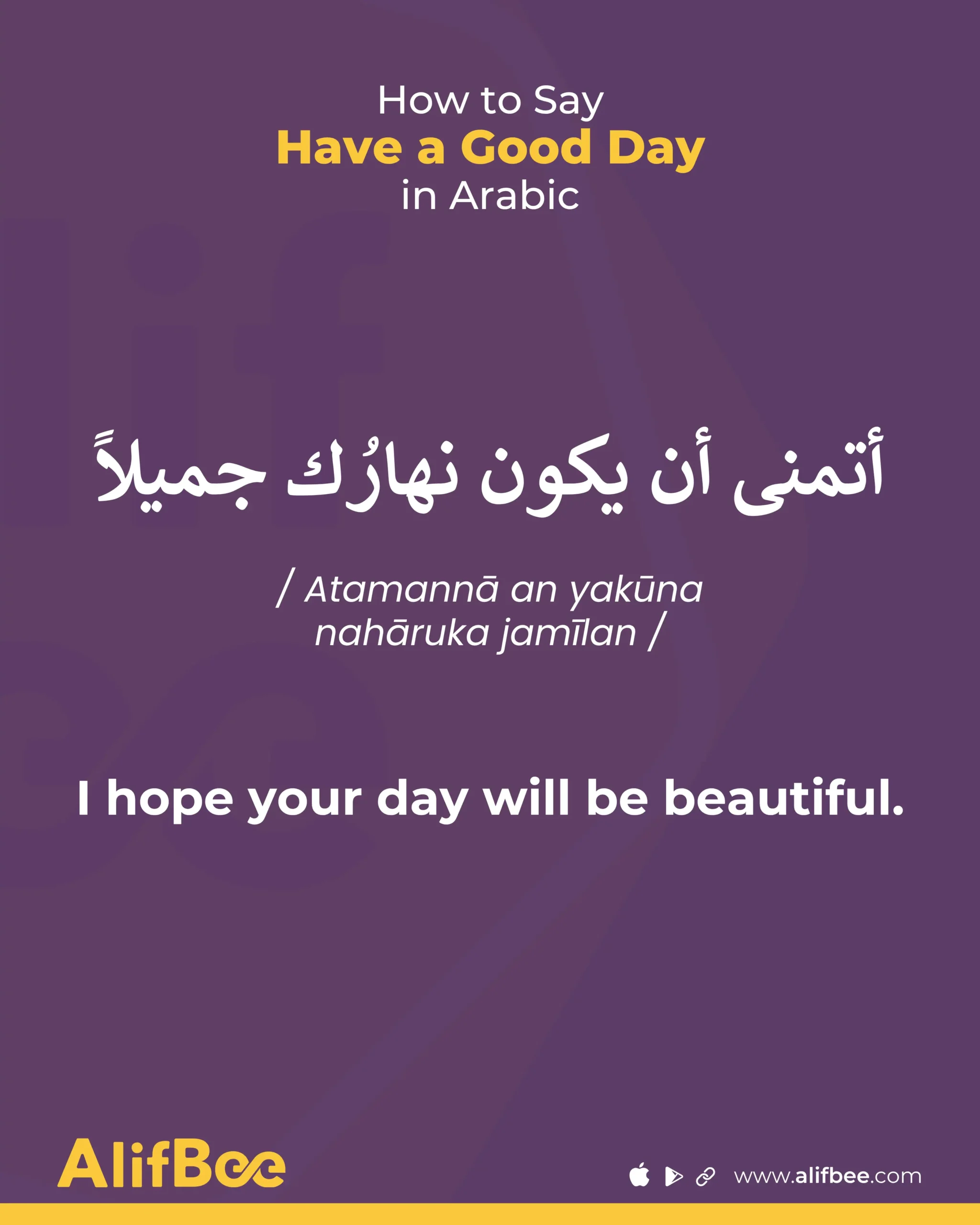 This is one of the warmest ways to wish someone well in Arabic. It literally means “I wish for you a happy day.” The phrase comes from the verb أتمنى (atamannā) — I wish or I hope — a word that carries sincerity and care. When you say لك (laka), you’re saying “for you” — addressing someone directly with kindness. You can also use لكِ (laki) when speaking to a female.