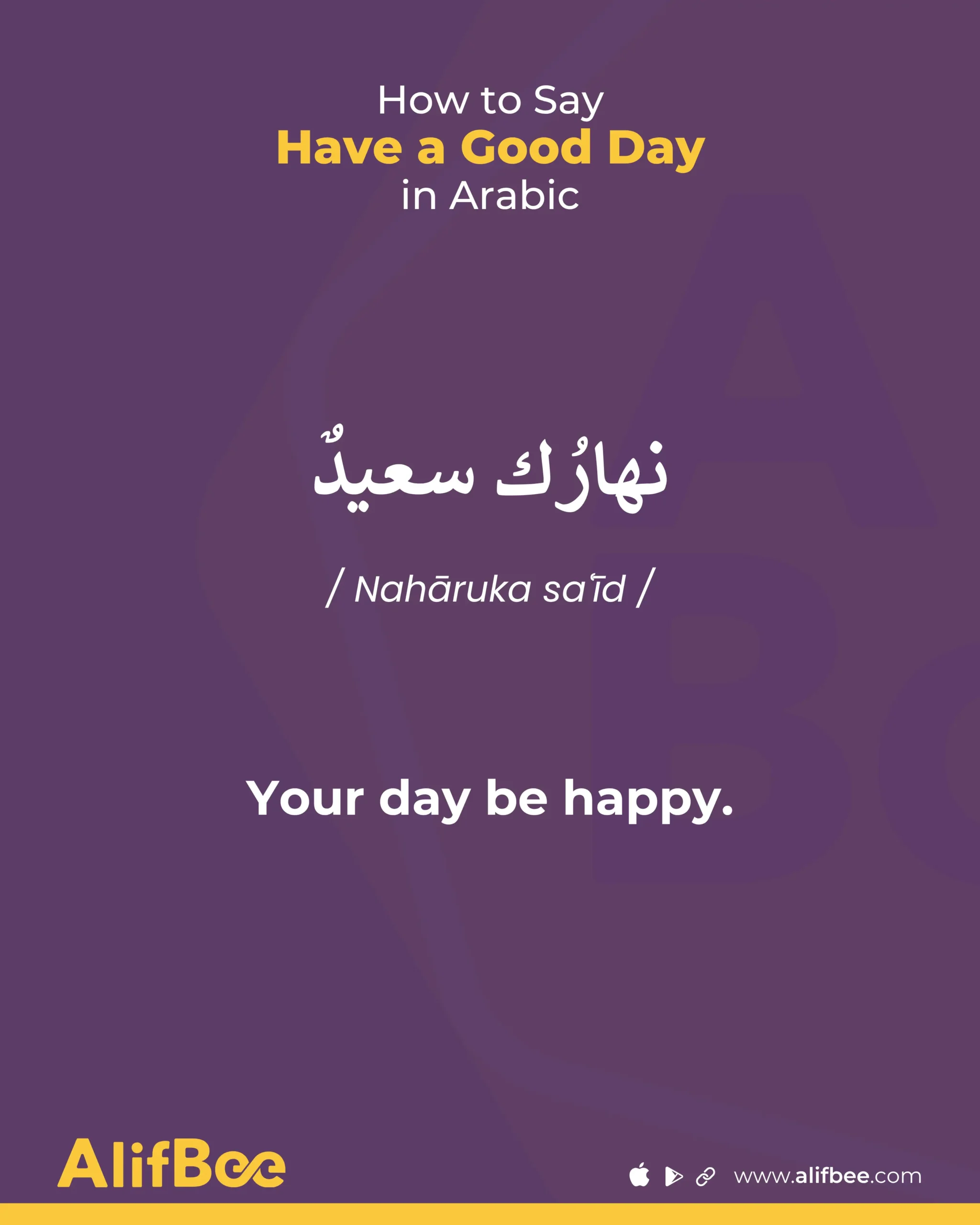 This is a classic and friendly Arabic greeting. It’s often used the same way you’d say “Good day” or “Have a nice day” in English. The word نهارك (nahāruka) means your day, and سعيد (saʿīd) means happy
