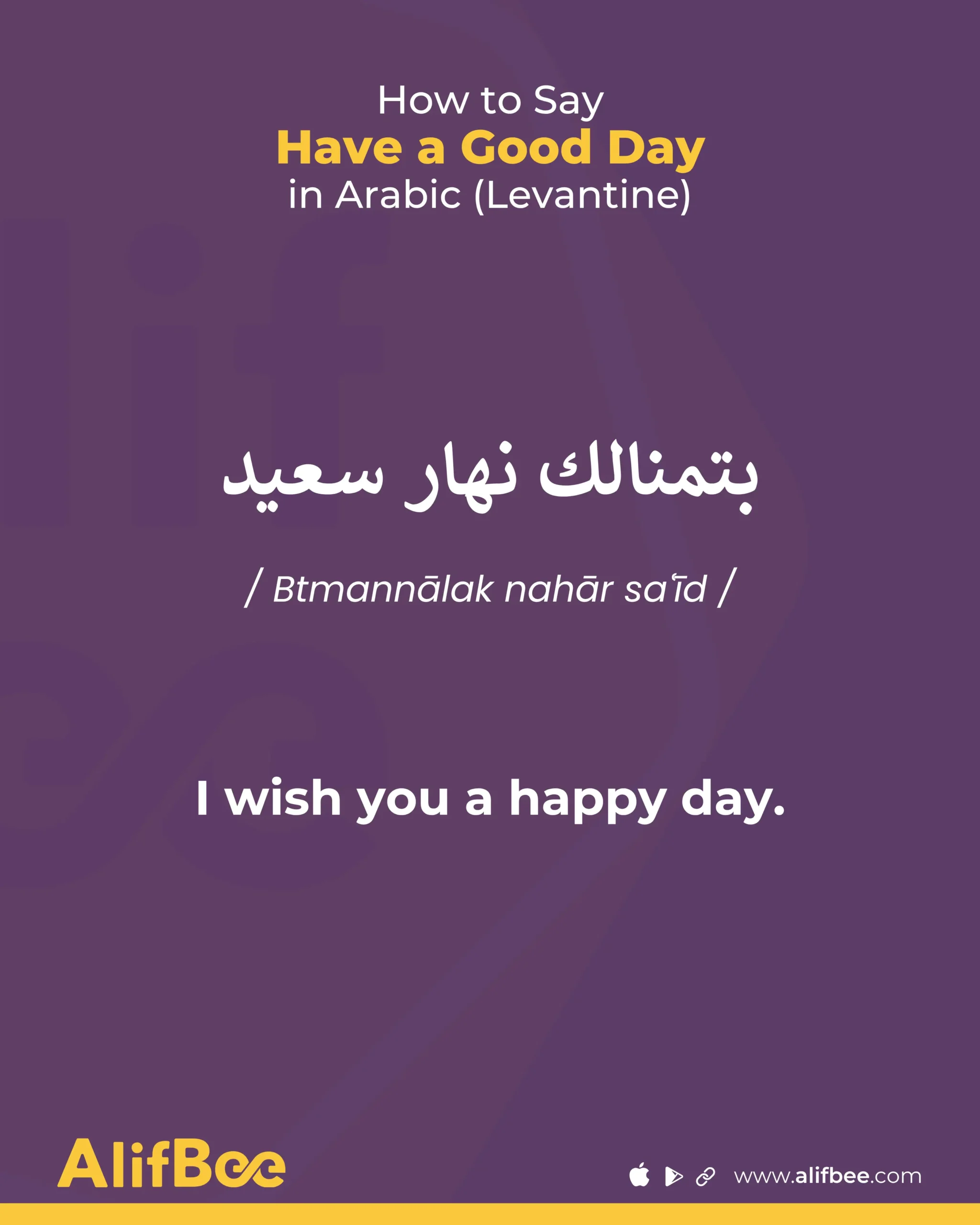 This is the Levantine (spoken) Arabic version of أتمنى لك نهارًا سعيدًا. It’s warm, friendly, and much more common in daily conversations than the formal version.