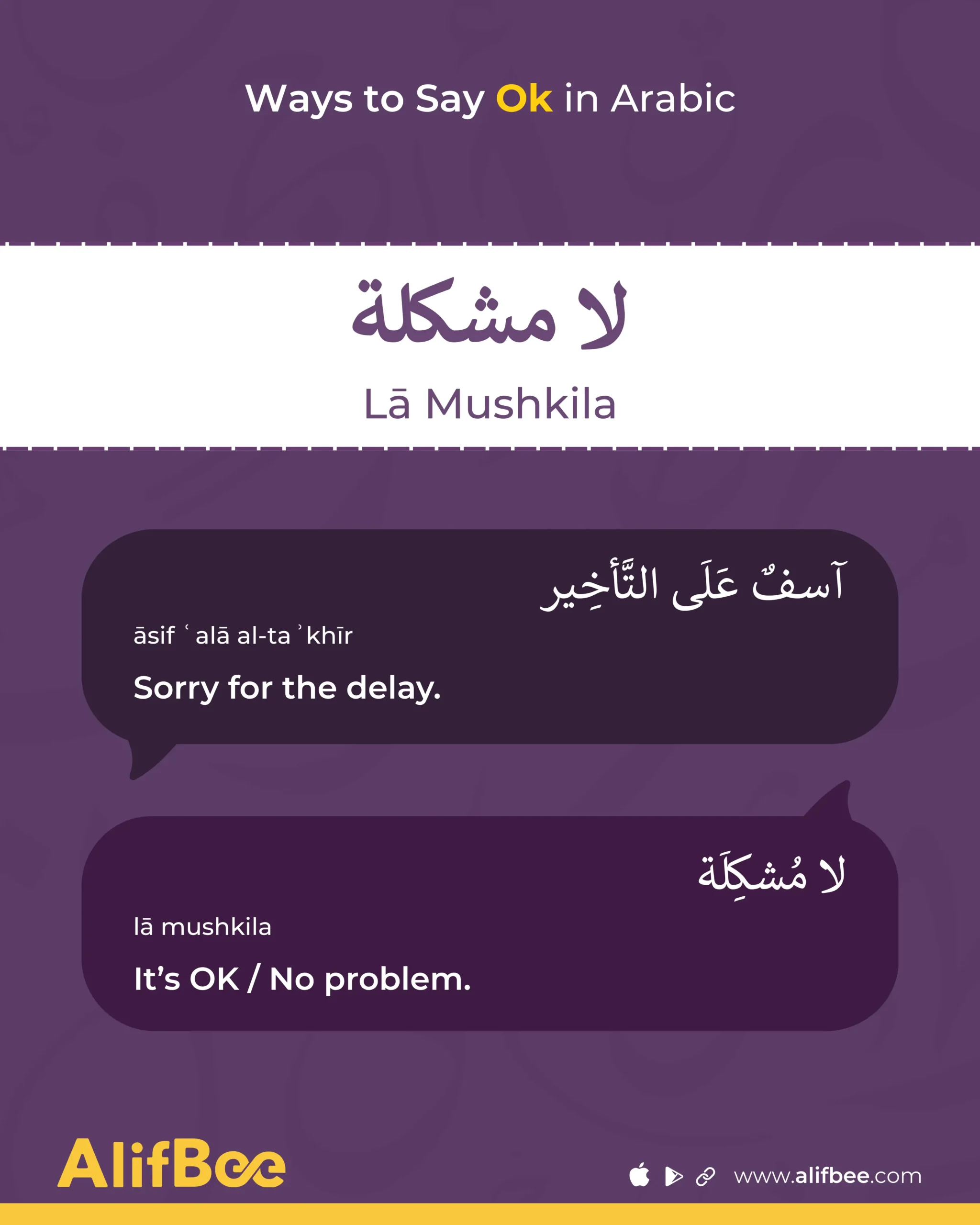 Lā ba’s means it’s okay or that’s fine. It sounds calm and slightly more polite than lā mushkila. It is often used to reassure someone or to give gentle approval without strong emotion.