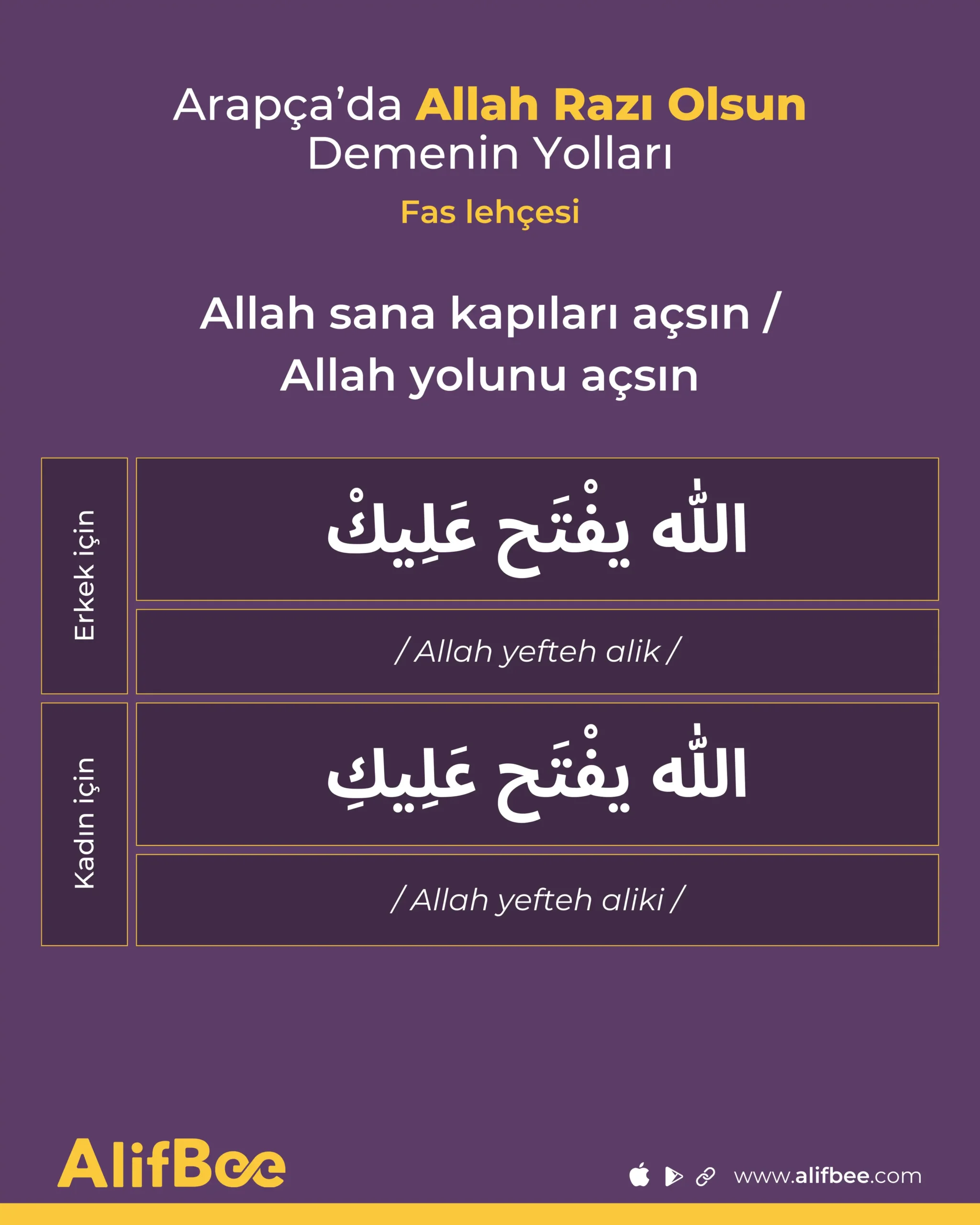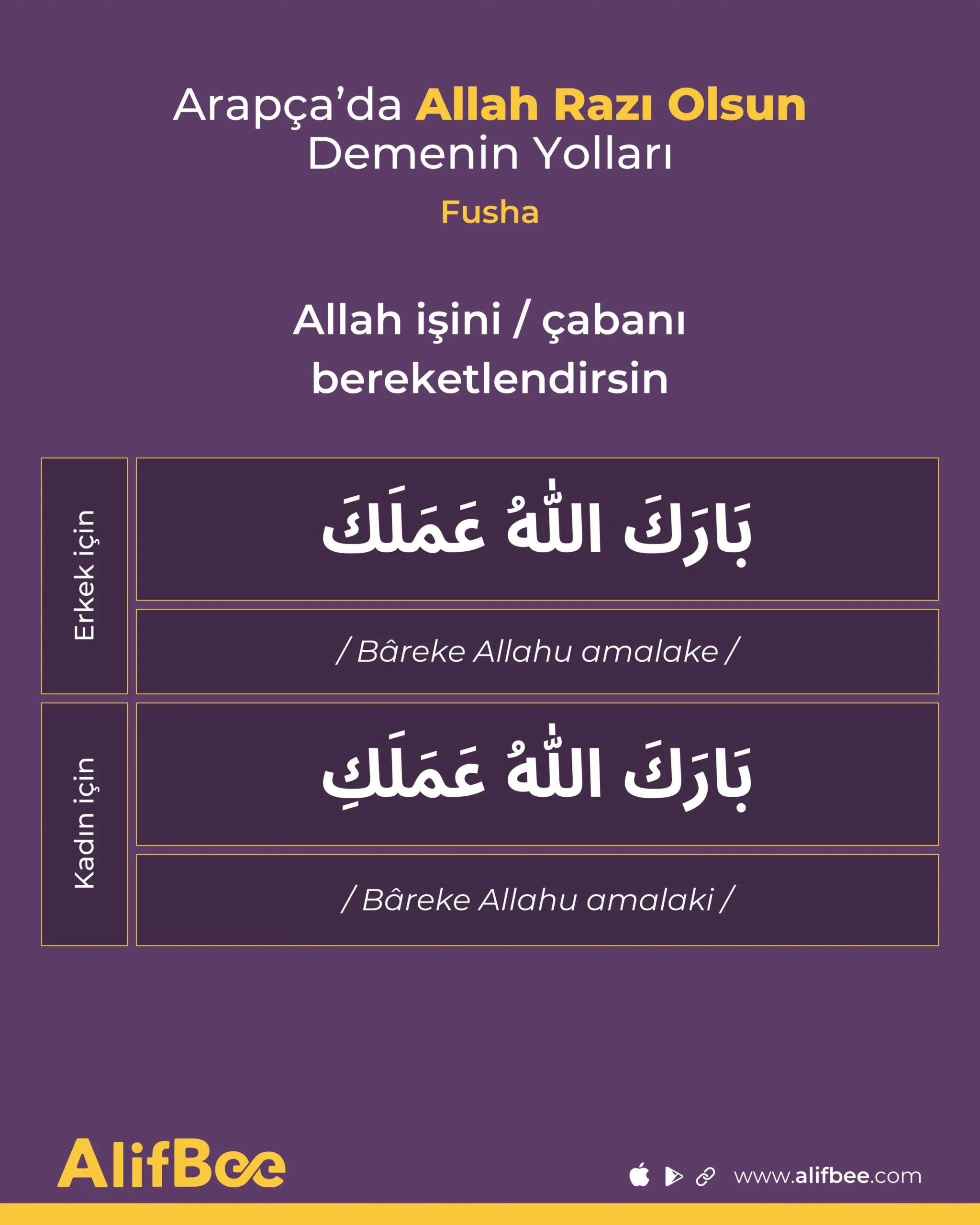 Aşağıda, “Allah bereket versin / Allah razı olsun” anlamına gelen sekiz farklı Arapça ifadeyi, arka planları ve kullanılma bağlamlarıyla birlikte bulabilirsin.