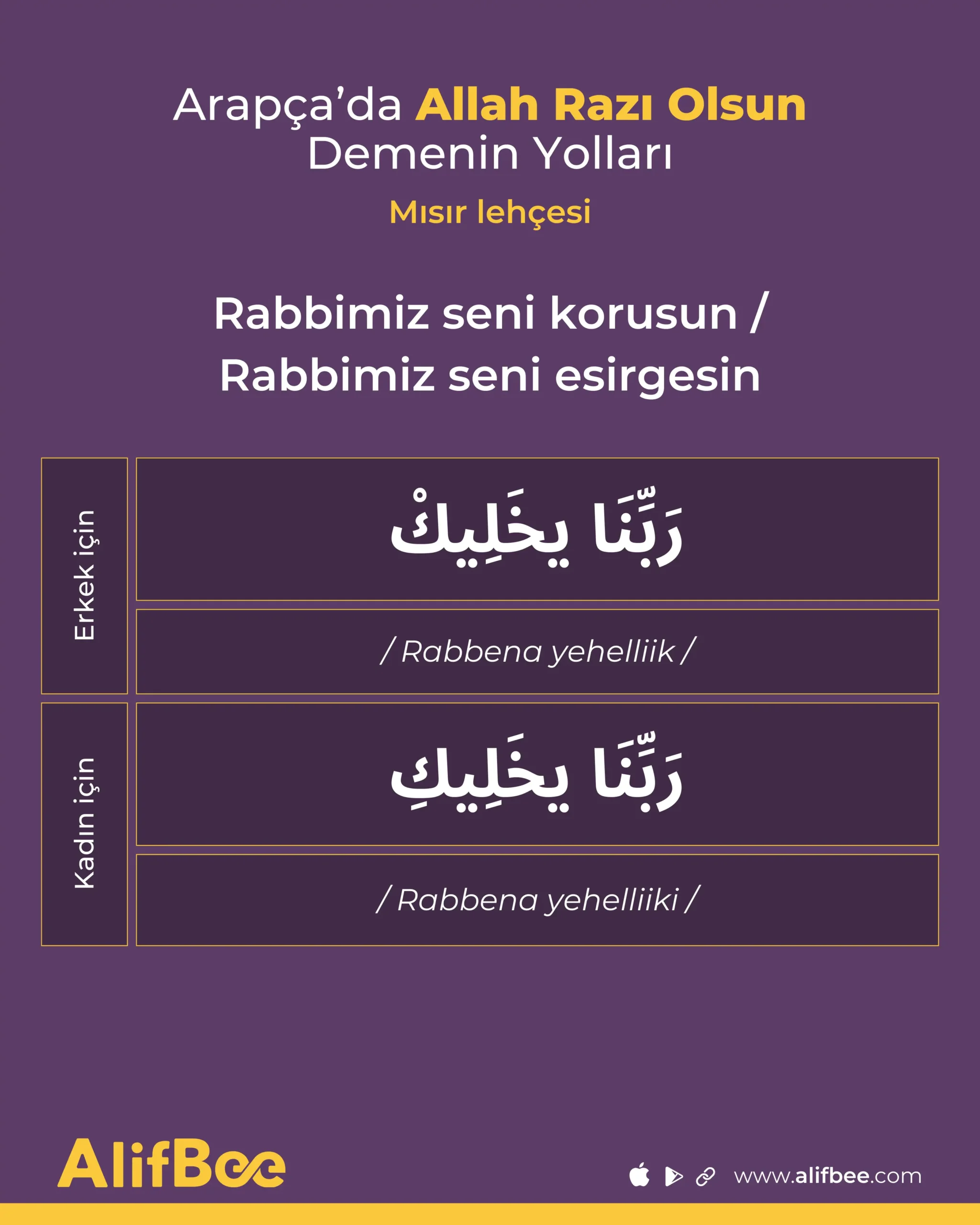 Arapça öğrenmeye yeni başlıyorsan, diğer ifadelere geçmeden önce bu kalıbı öğrenmeni ve iyi derecede ustalaşmanı öneririz. Hem basit hem nazik bir ifadedir; dini ve din dışı durumların her ikisi için de uygundur.