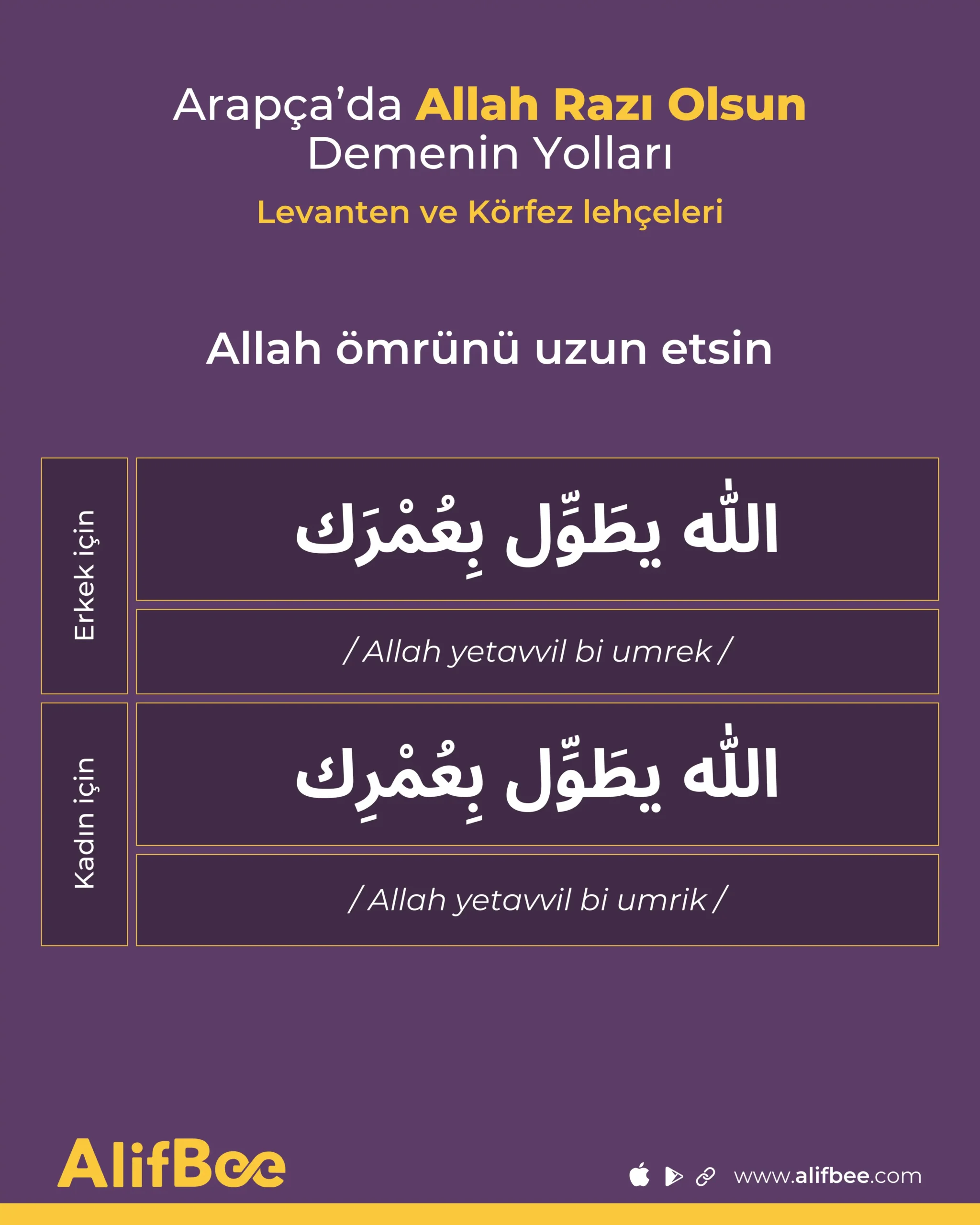 Levanten bölgelerde, insanlar bu ifadeyi yaşlılara uzun ömür ve saygı dilemek için kullanır. Körfez’de ise “طال عمرك” (tal umrek) ifadesi erkekler için benzer şekilde kullanılır. Kadınlar için ise ifade Allah yetavvil bi umrik şeklinde değiştirilir.