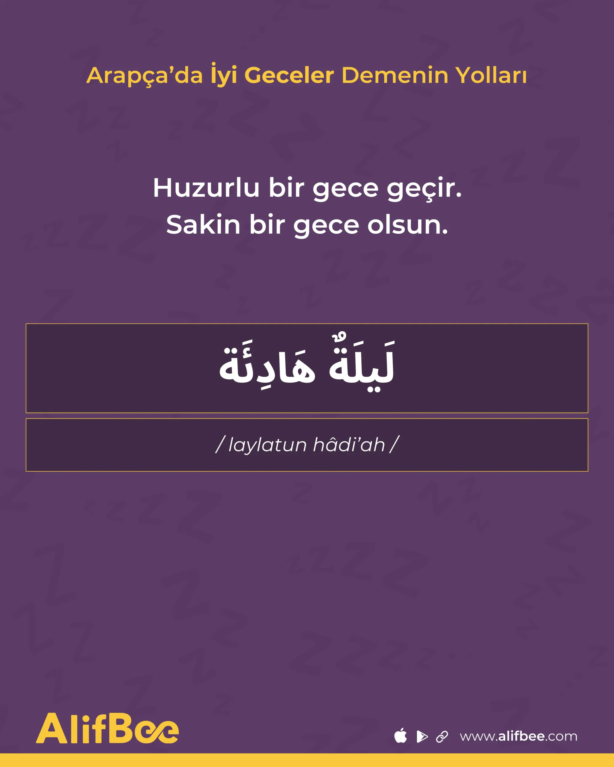 Yatmaya giderken birinin Laylatun hâdi’ah (لَيْلَةٌ هَادِئَة) dediğini duymanız daha olasıdır. Türkçe’deki “Hayırlı geceler” ifadesine benzer şekilde, karşı tarafa huzurlu bir gece dilemek anlamına gelir.