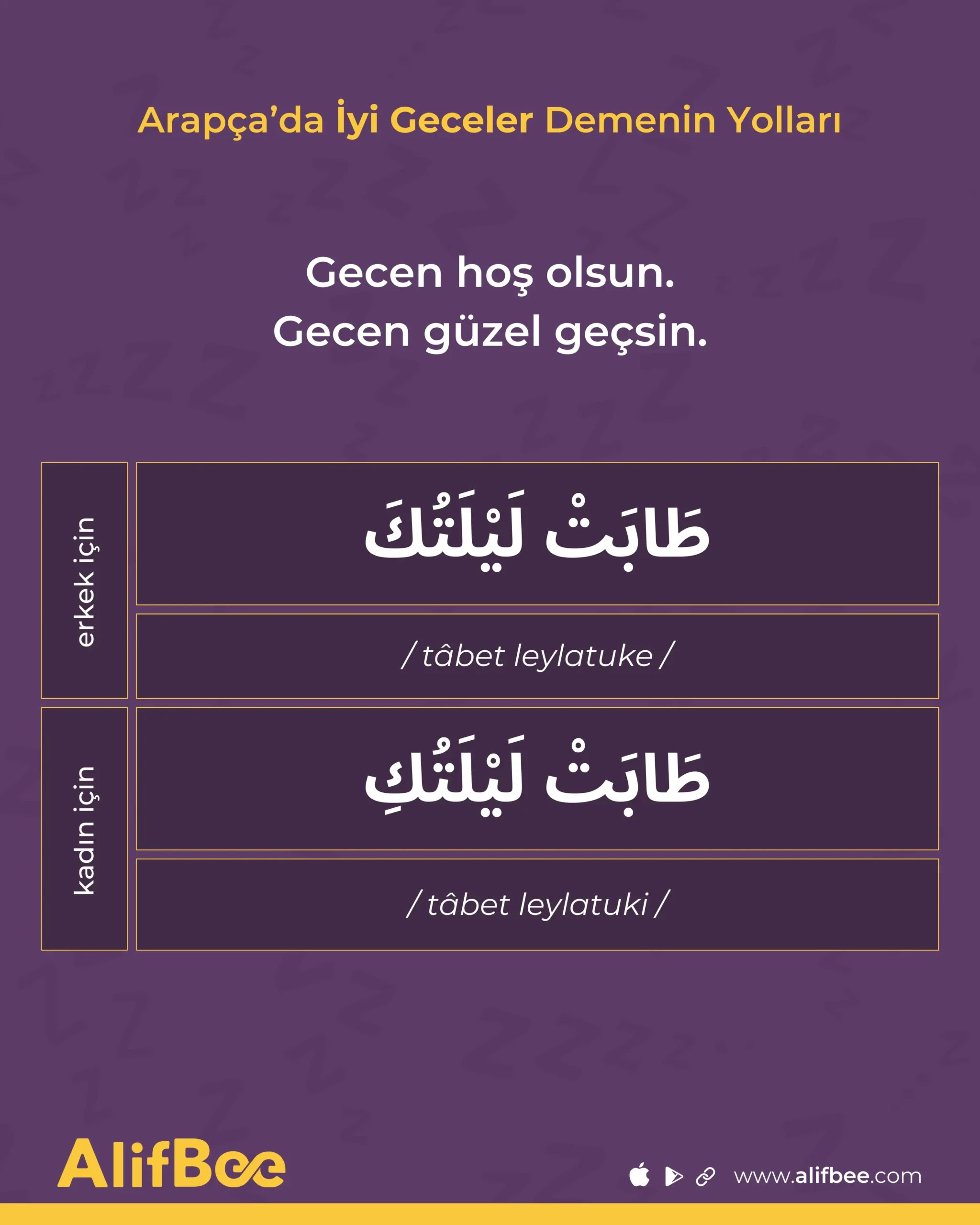 Listede sıradaki ifade olan Tâbet leylatuke (طَابَتْ لَيْلَتُكَ), Arapça’da iyi geceler dilemenin daha resmî ve edebî bir yoludur. Hatta klasik Arapça metinlerde, romanlarda, şiirlerde ve gazetelerde bu ifadeye rastlayabilirsiniz. Kelime anlamı “Gecen hoş olsun.” ya da “Gecen güzel geçsin.” demektir. Bir kadına hitap ederken Tâbet leylatuki (طَابَتْ لَيْلَتُكِ) demeniz gerekir.