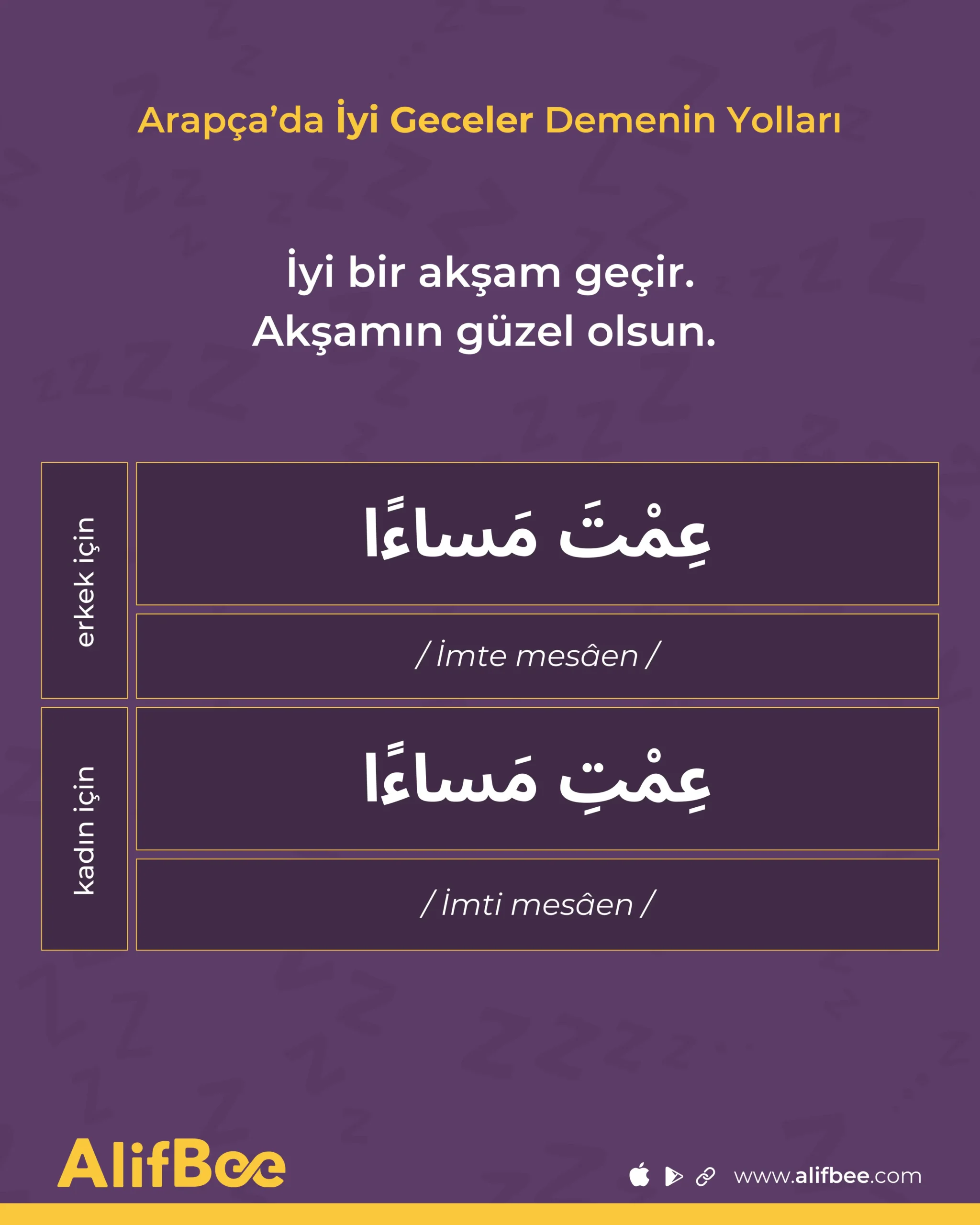 İmte mesâen (عِمْتَ مَسَاءً), Tâbet leylatuke ifadesine benzer şekilde, Arapça’da iyi geceler ya da iyi akşamlar dilemenin klasik ve zarif bir yoludur. Kelime anlamı “İyi bir akşamın olsun.” ya da “Akşamın güzel geçsin.” demektir. Bir kadına hitap ederken İmti mesâen (عِمْتِ مَسَاءً)” demeniz gerekir. Bu ifade günümüzde nadiren kullanılır; ancak eski ve şiirsel Arapça üslubu anlamak açısından önemli bir örnektir.