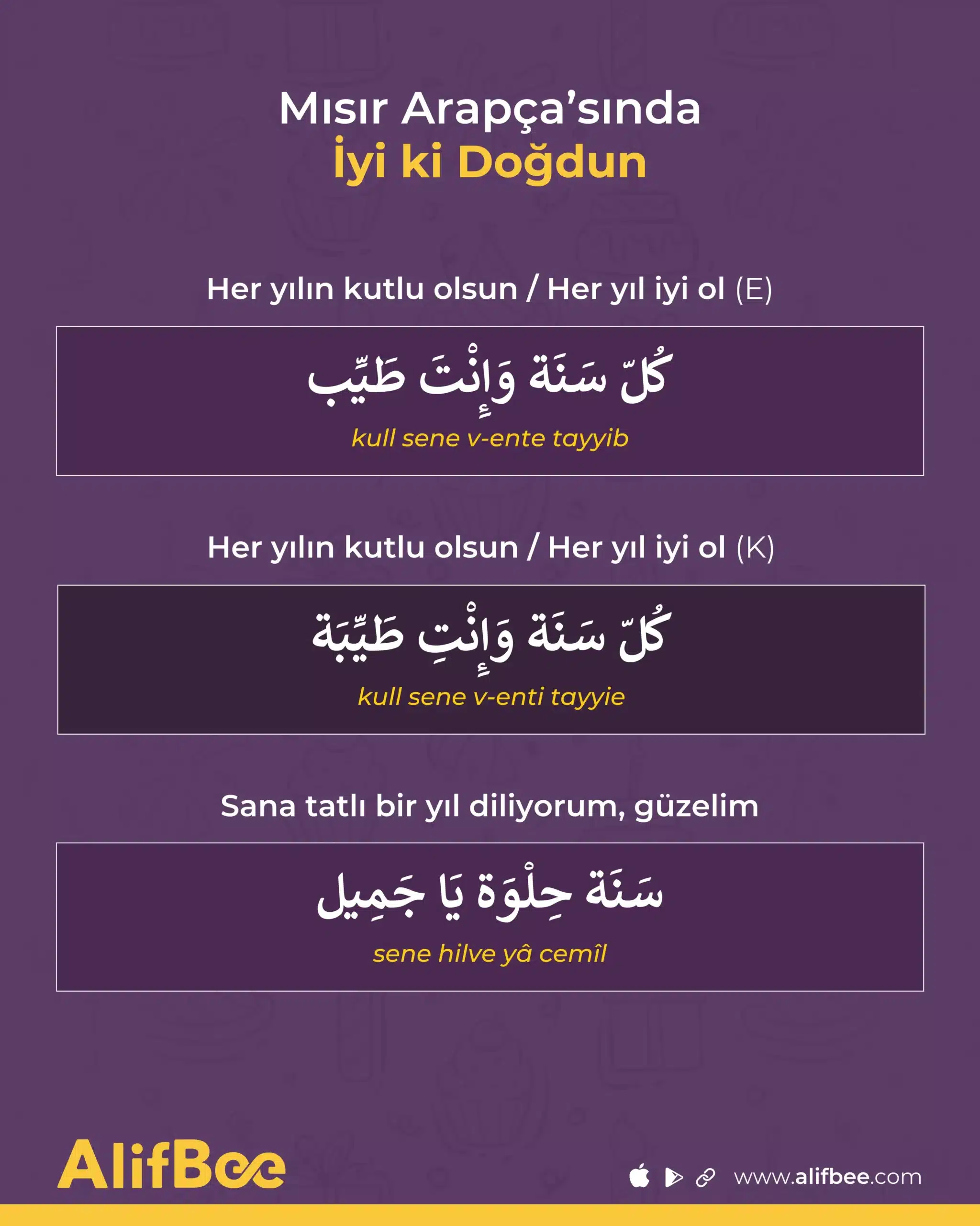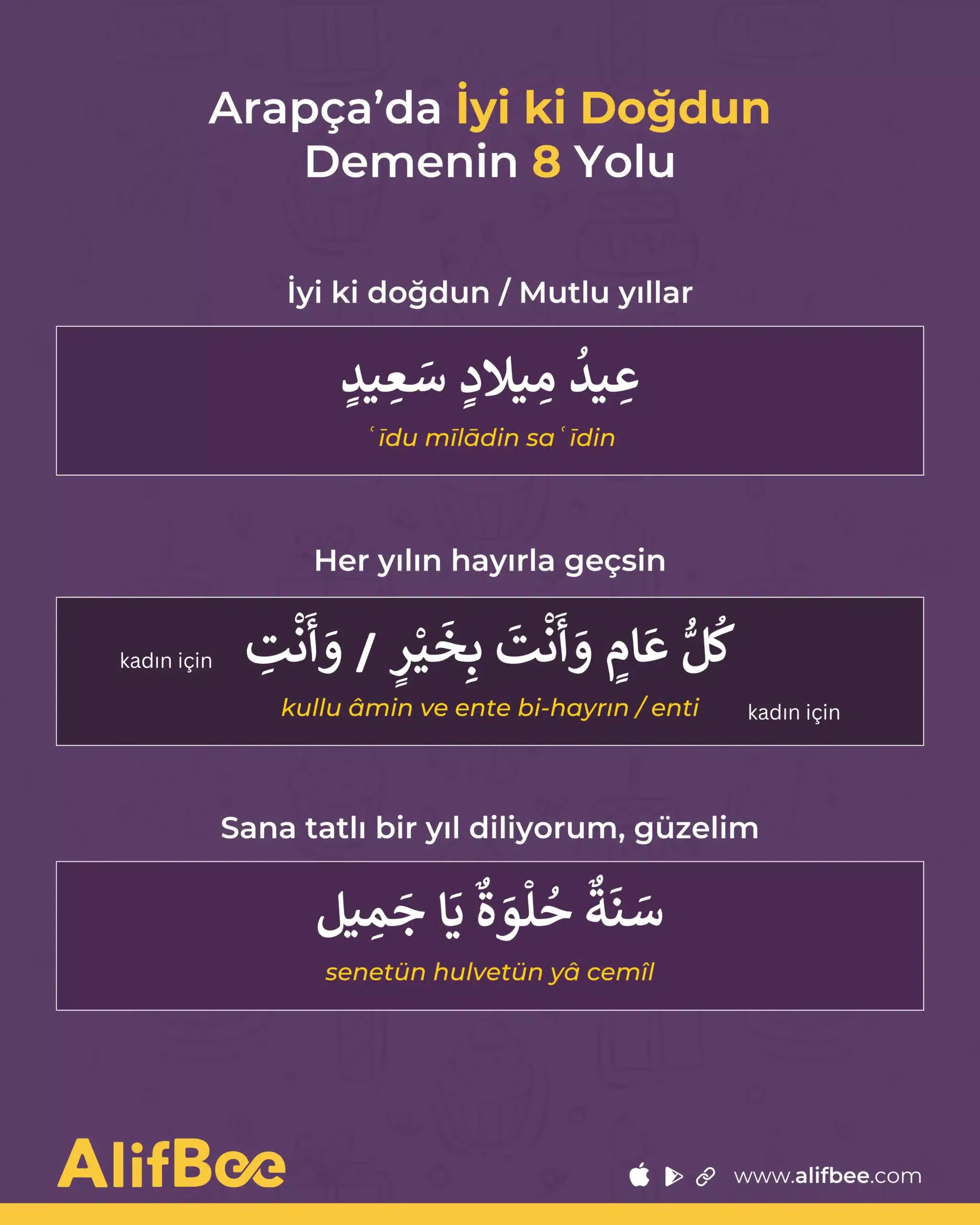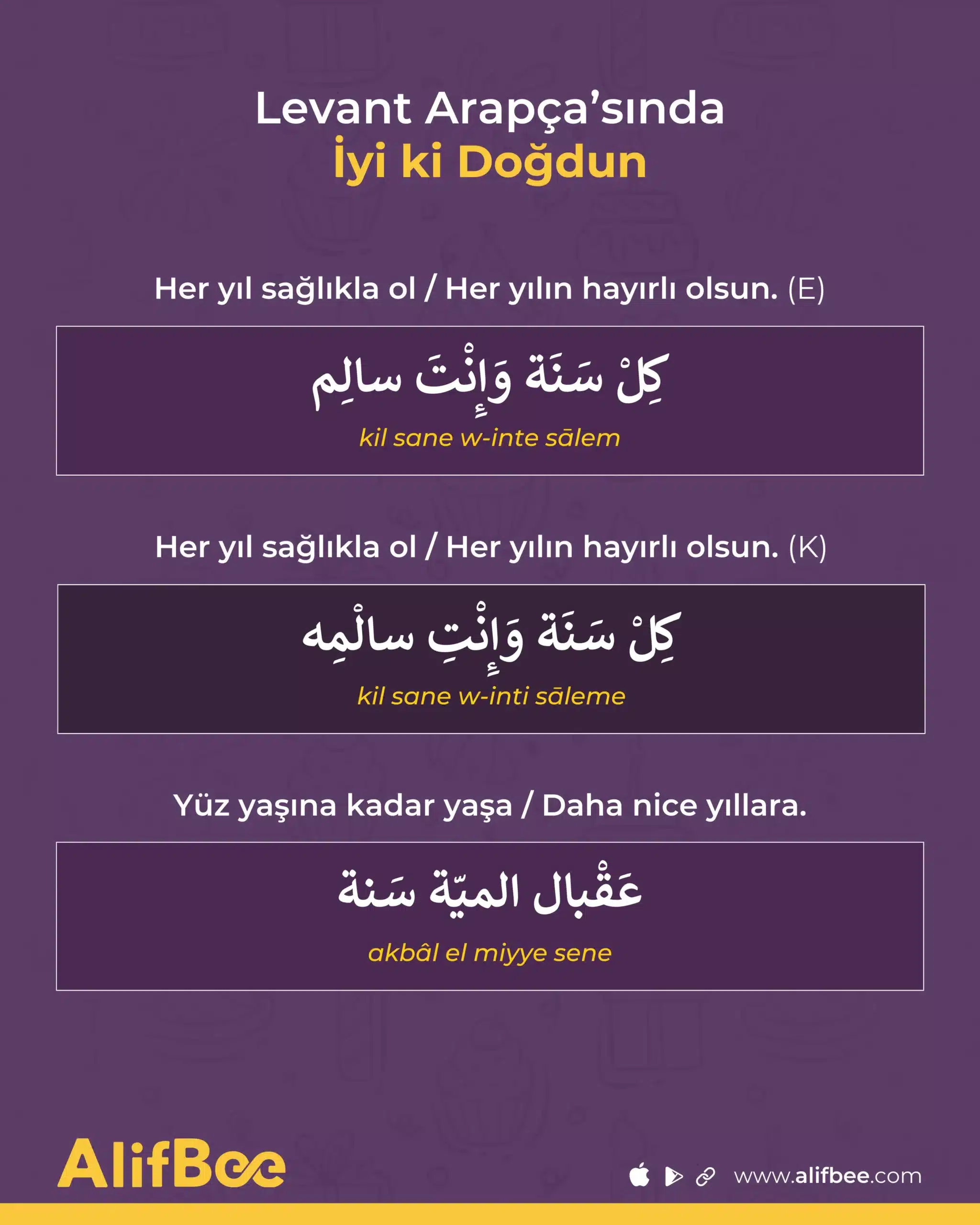 Şimdi, doğum günü kartlarında Modern Standart Arapça’da kullanılan, daha resmî Arapça ifadelere geçelim.