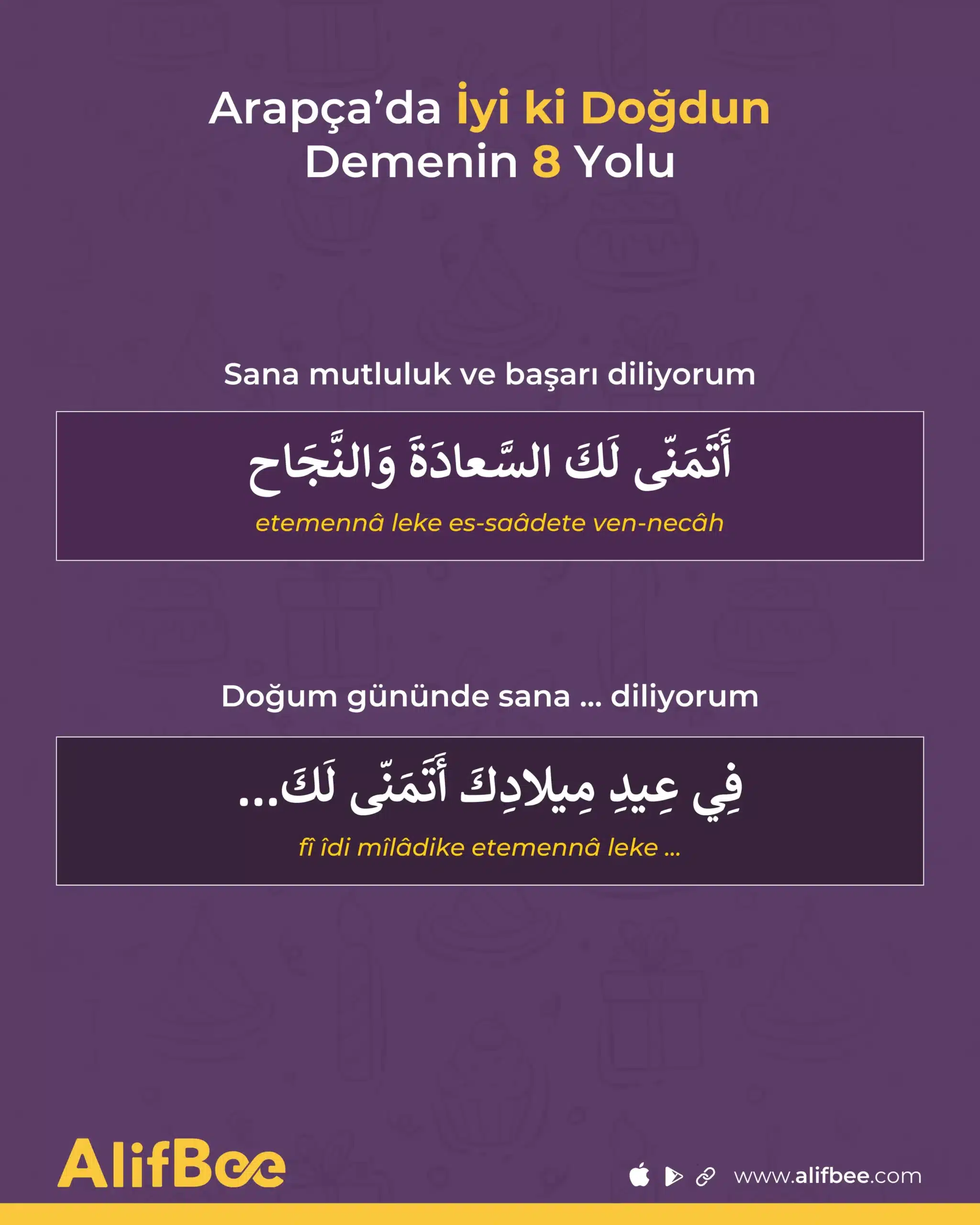 Böyle özel bir günü hatırlamak, doğum günü olan kişi bunu açıkça göstermese bile onun için çok şey ifade eder. Bu tür buluşmalar, aile ve sevdiklerinizle yeniden bağ kurmak için harika fırsatlardır. Burada, her duruma uygun olabilecek ifadelere yer verdiğimiz için, bu Arapça doğum günü ifadelerini ailenizle, arkadaşlarınızla ve hatta iş arkadaşlarınızla kullanarak pratik yapın.