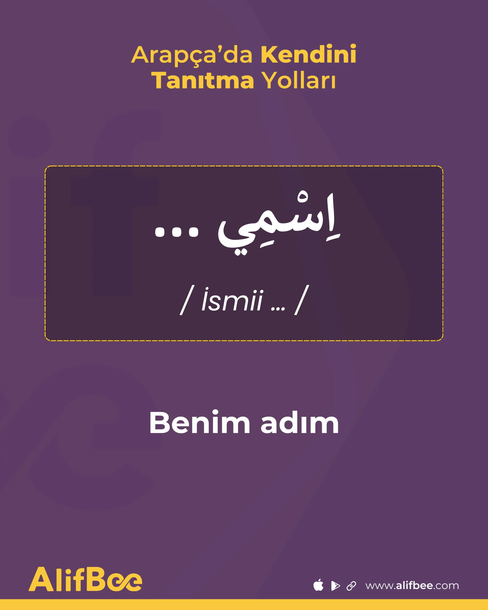 Arapça’da kendini tanıtmanın en yaygın yolu “İsmii” (اِسْمِي) ifadesidir. Bu “Benim adım…” anlamına gelir. Sadece kendi adını eklersin. Ayrıca, kelime hem erkekler hem kadınlar için aynıdır yani değiştirmene gerek yoktur.