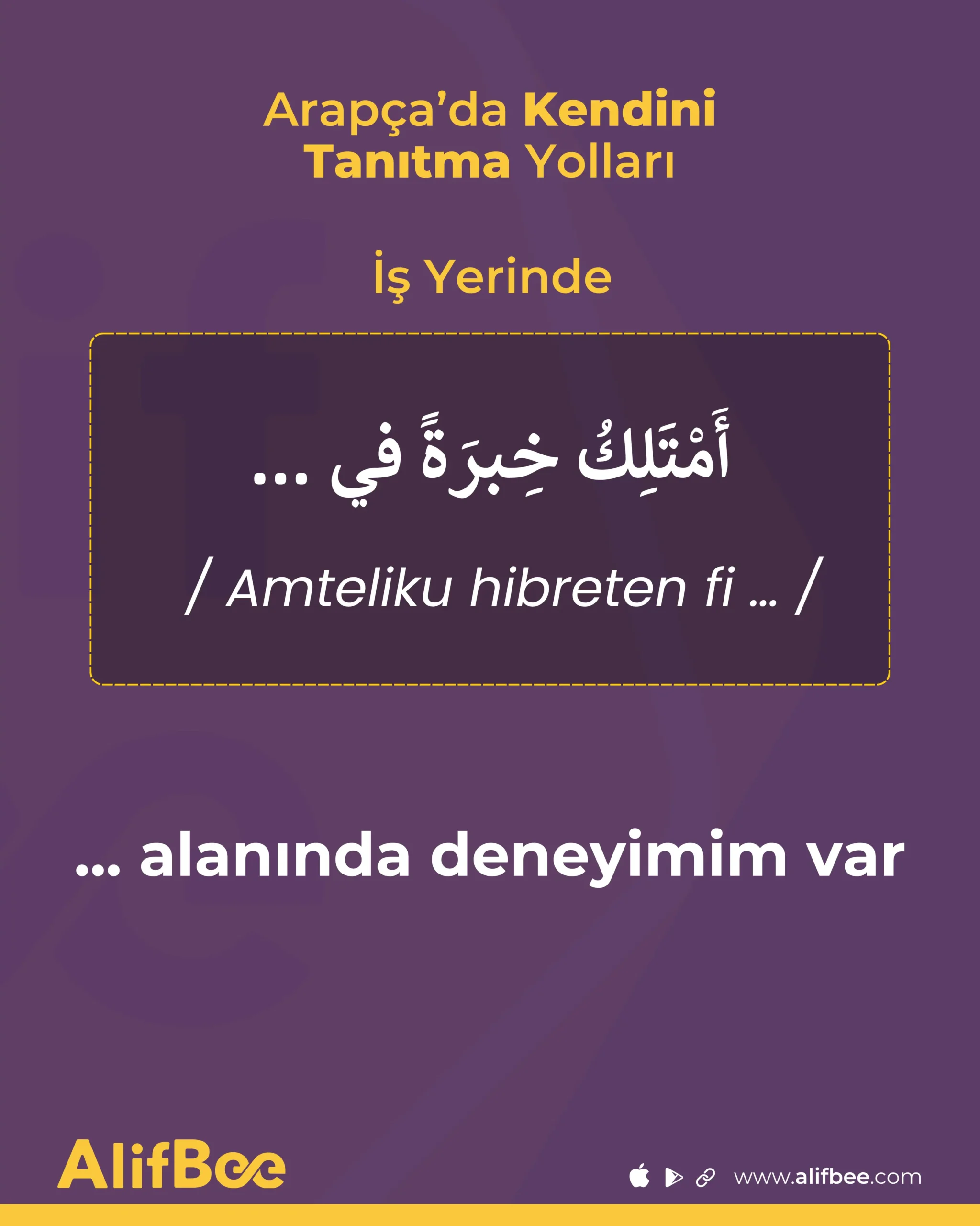 Bu basit yapıyı, pozisyonunu ve çalıştığın yeri anlatmak için kullanabilirsin. Genellikle bu ikisi tek cümlede söylenir. Arap ülkelerinde insanlar çoğunlukla şirket adını vermez, özellikle şirket çok bilinen değilse; ancak sektörlerinden bahsetmekten gurur duyarlar.