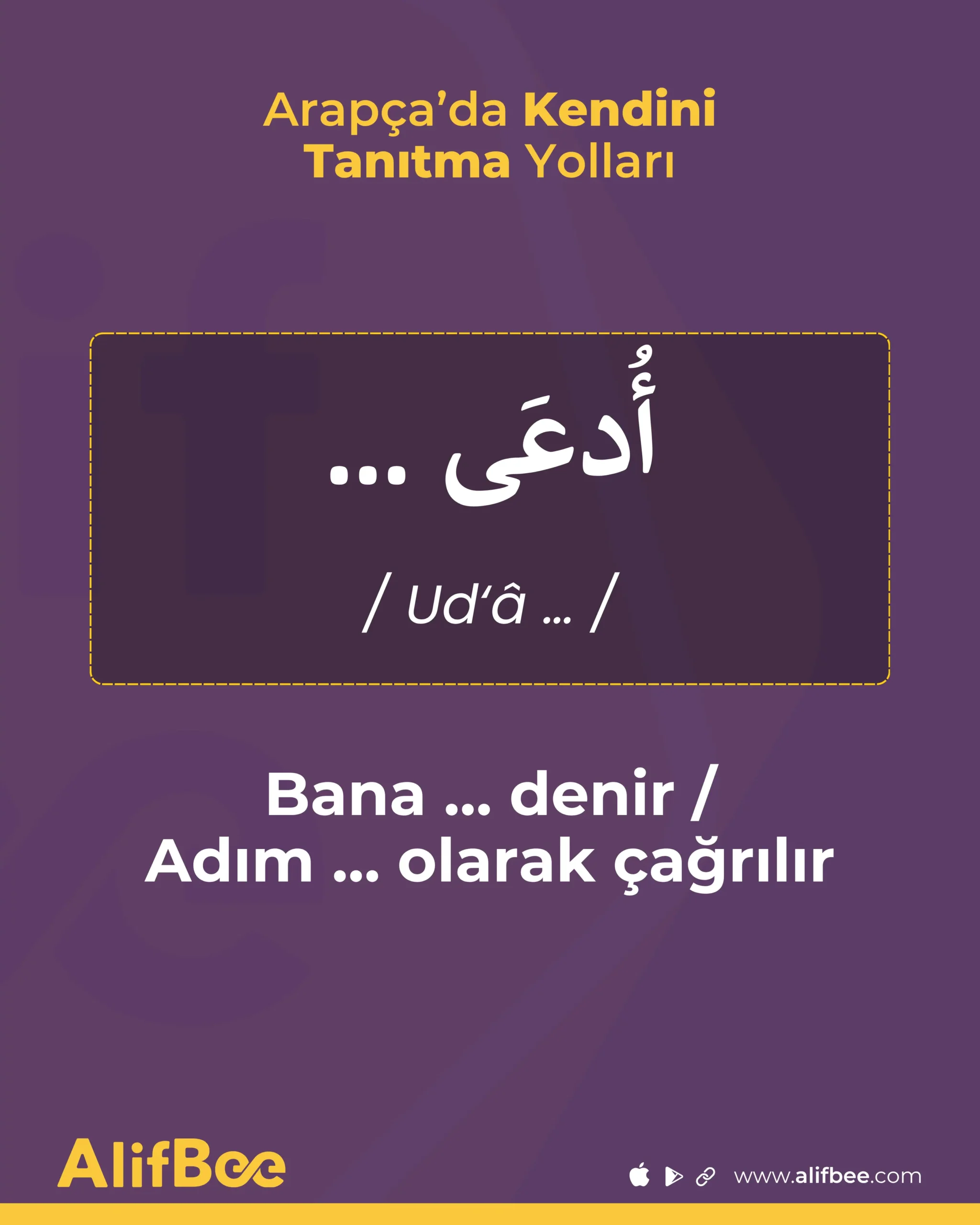 Arapça’da kendini tanıtmanın bir diğer kolay yolu da “Ud‘â” (أُدعَى) ifadesini kullanmaktır. Bu, “Bana … denir” anlamına gelir ve hem erkek hem kadın konuşmacılar için aynıdır.