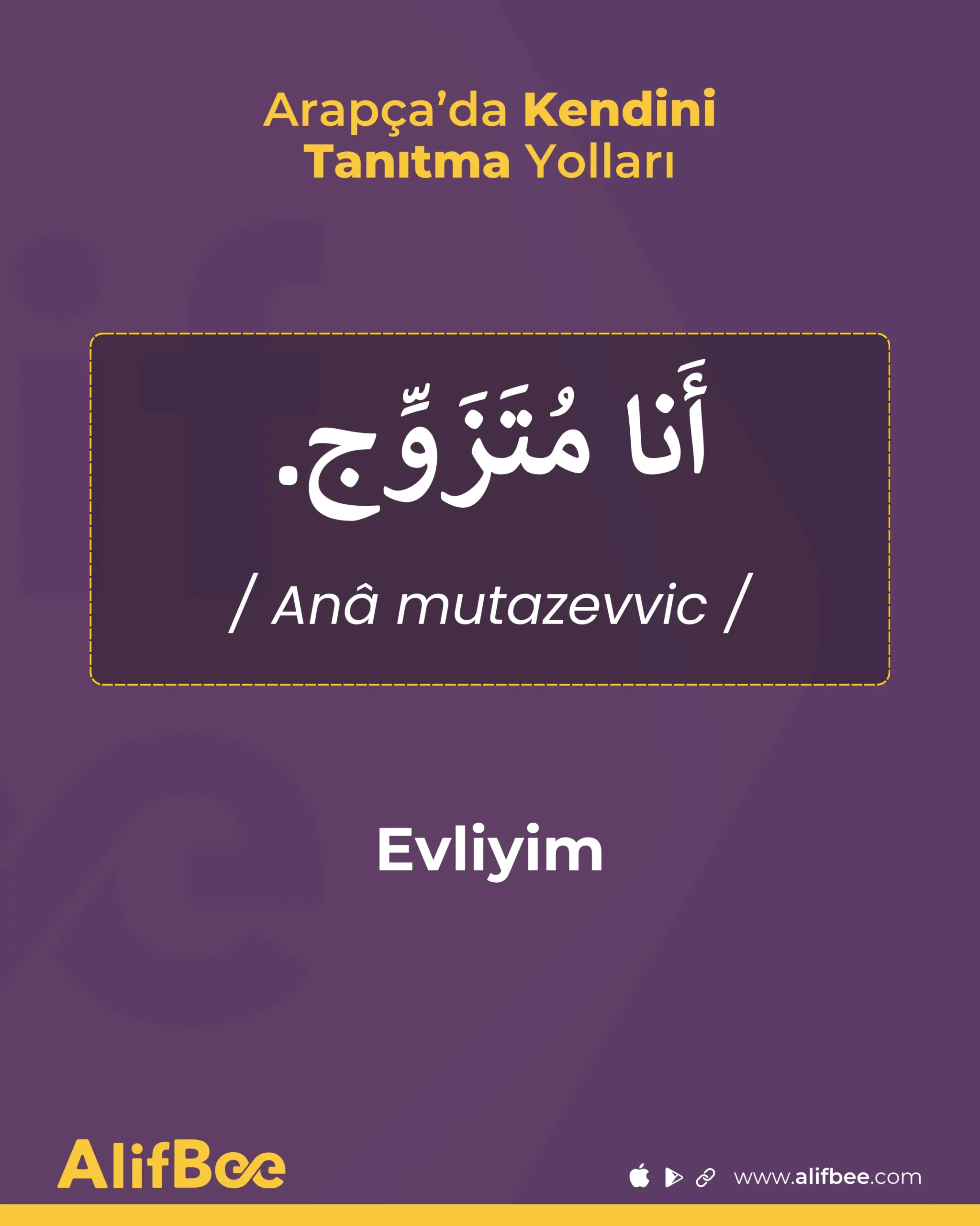 Arapça’da sosyal durumunu tanımlamanın en basit yolu, tekil zamir Anâ أنا + sıfat kullanmaktır (bekâr, evli, nişanlı vb.). Unutma, sıfatlarda cinsiyet önemlidir! Dişi form için genellikle ـة eklenir. İşte birkaç örnek: