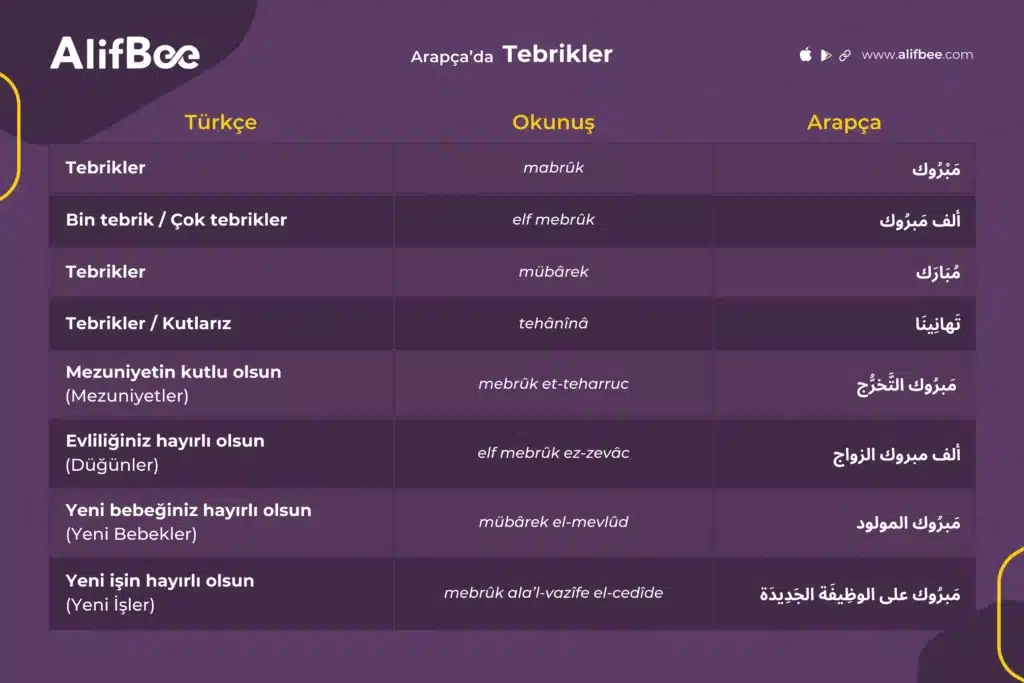 Şimdi Arapça’da birini tebrik etmenin en yaygın yollarına göz atalım. Bu ifadeler dil genelinde yaygın olarak kullanılır ve her durumda birinin mutluluğunu paylaşmayı öğrenmenize yardımcı olur.