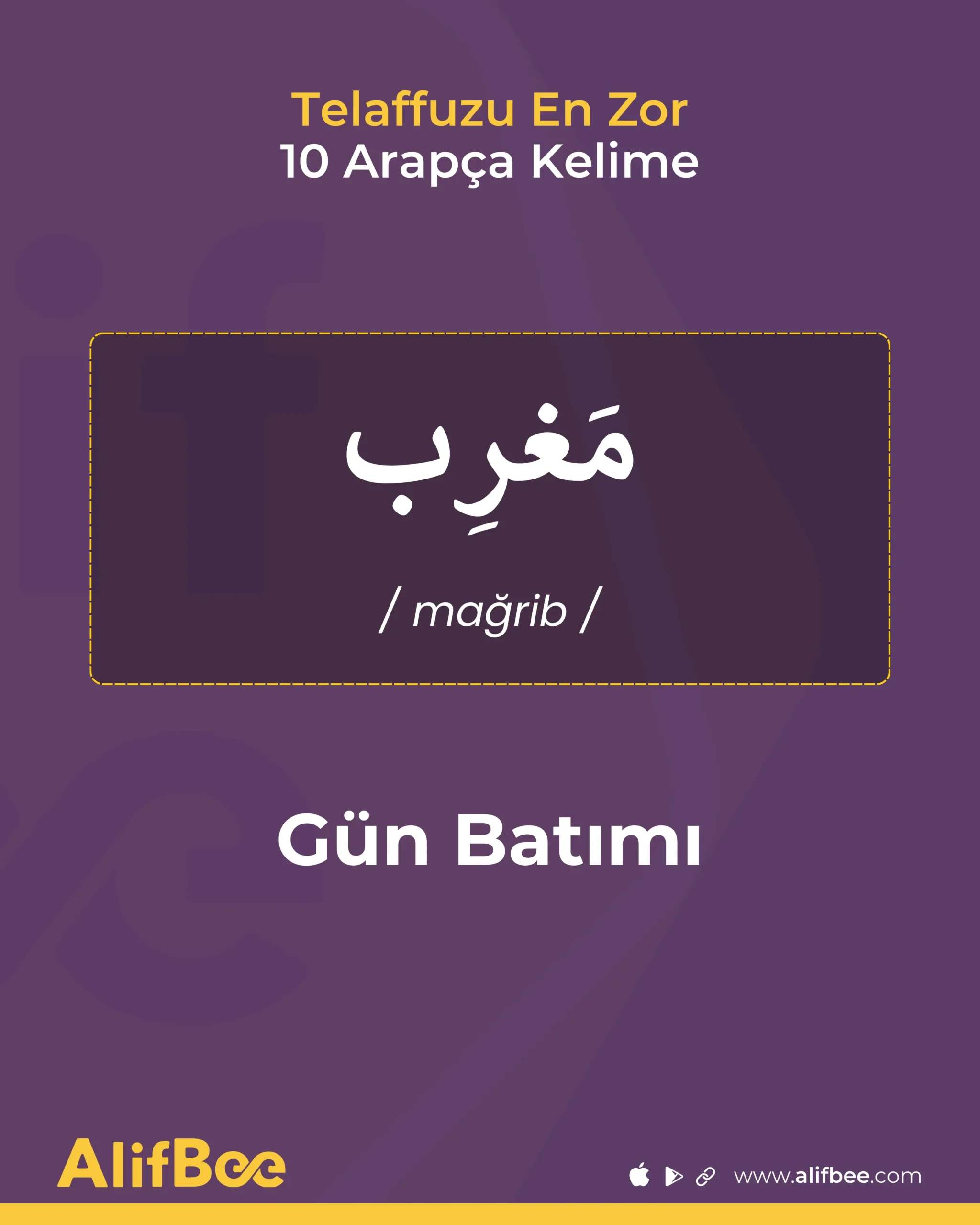 İpucu: Kelimeyi üç vuruşta söyleyin: ma–ğ–rib “Ğ”den sonra “r”yi hafifçe titreştirerek geçin.